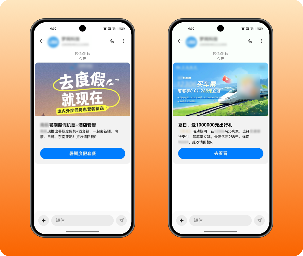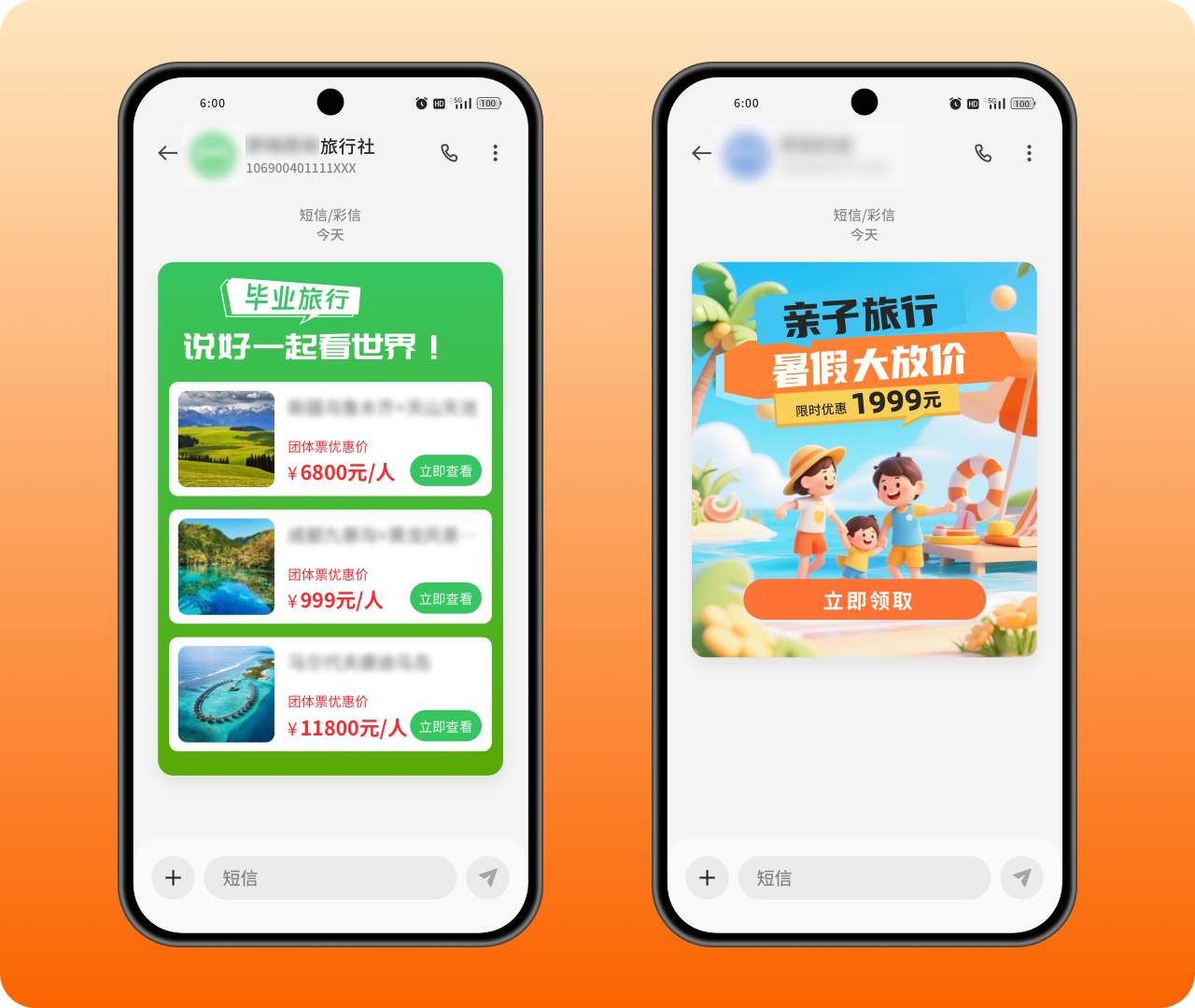 凭借DB真·人(中国)科技5G阅信的个性化触达功能,品牌商家能够根据用户的兴趣、行为和偏好,实现不同群体的精准信息推送。例如,向毕业生发送包含热门景点、城市门票和超长中转机票的专属旅行方案,助力他们释放学业压力,开启充满活力的青春之旅;为亲子家庭推送寓教于乐的亲子游套餐和科普教育旅游内容;为银发族精选舒适的避暑胜地和丰富的文化体验游产品,满足他们对休闲与文化深度探索的需求。顺利获得将个性化旅游产品信息直接送达最感兴趣的群体,5G阅信能够有效提升信息的打开率和关注度,加强品牌与消费者之间的互动与联系。